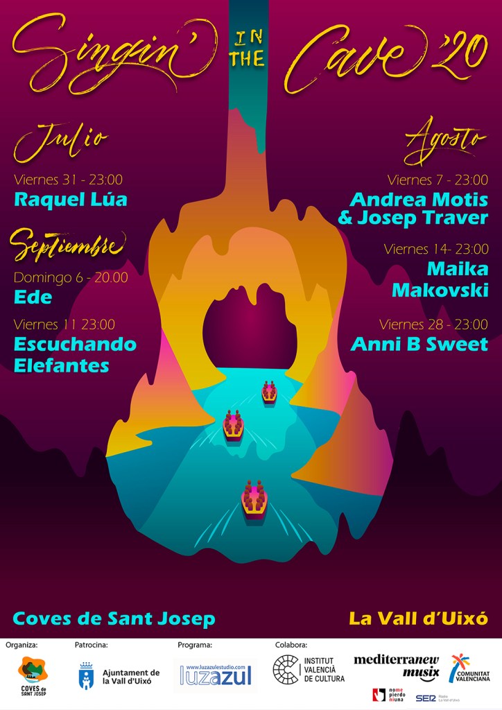 El Singin’ in the Cave ha presentado este jueves el cartel de 2020, en la que será la quinta edición de este peculiar ciclo de conciertos que se celebra en el interior de les Coves de Sant Josep, declaradas Patrimonio Mundial por la UNESCO y ubicadas en la Vall d’Uixó (Castellón). Habrá cambios en el formato y menos entradas a la venta, pero manteniendo la magia de una propuesta musical realmente única. Raquel Lúa (31 de julio), Andrea Motis & Josep Traver (7 de agosto), Maika Makovski (14 de agosto), Anni B Sweet (28 de agosto), Ede (6 de septiembre) y Escuchando Elefantes (11 de septiembre) se subirán a la barca para cantar en el interior del río subterráneo navegable más largo de Europa.