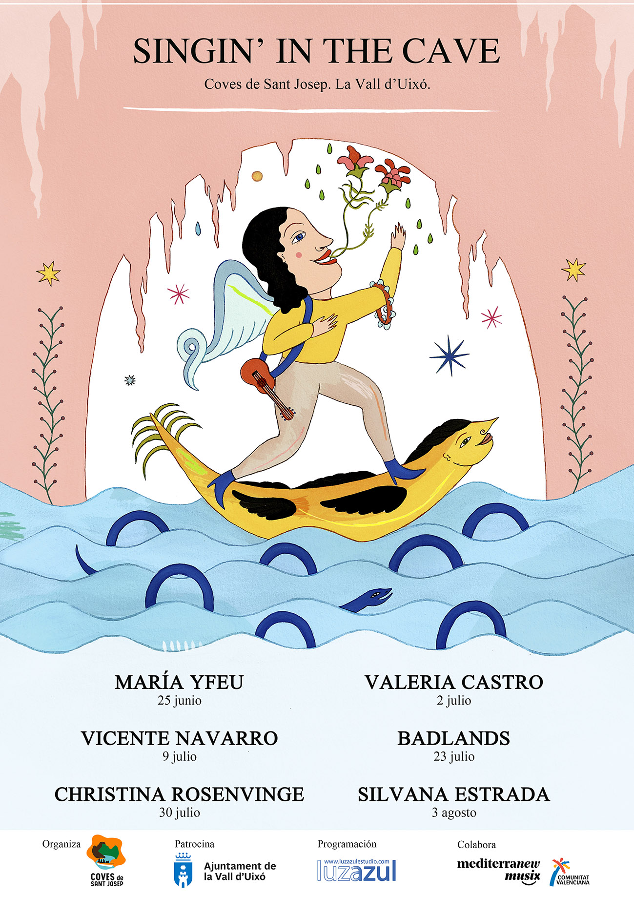 El diseño del cartel es obra de la artista plástica de la Vall d’Uixó Belén Segarra. Licenciada en Bellas Artes por la Universidad Politécnica de Valencia, trabaja como ilustradora freelance y directora de arte en varios proyectos audiovisuales y fotográficos. Sus ilustraciones son reconocibles al instante. Personajes y mundos que aparecen inocentes pero al mirarlos se vuelven complejos. “Para mí Coves es un lugar muy onírico, un poco irreal, y la música y la atmósfera que se crea cuando sucede, lo convierten todavía en algo más especial. Creo que es una experiencia mágica y quería que la ilustración nos llevara a ese universo”, explica Belén Segarra sobre su trabajo.