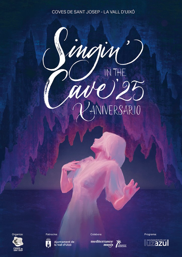 “Mi pasión por el arte se refleja tanto en mis obras de pintura al óleo, como en mi trabajo digital”, explica. “Para el cartel del décimo aniversario de Singin’ in the Cave quise capturar la esencia mágica de escuchar cantar a los artistas en un entorno tan único como Les Coves de Sant Josep. Mi intención fue transmitir la conexión íntima entre la naturaleza y el arte, destacando la atmósfera envolvente y casi onírica”, agrega.