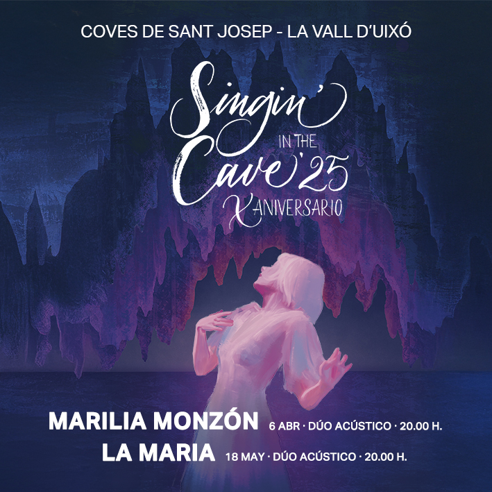 El Singin’ in the Cave anuncia dos nuevos conciertos en su programación de 2025. La canaria Marilia Monzón y la valenciana La Maria actuarán en les Coves de Sant Josep los días 6 de abril y 18 de mayo, respectivamente, en la décima edición consecutiva de este singular ciclo, que se celebra en el interior de les Coves de Sant Josep (la Vall d’Uixó, Castellón) y en el que los músicos actúan en puro acústico, con la única amplificación natural de la cueva.